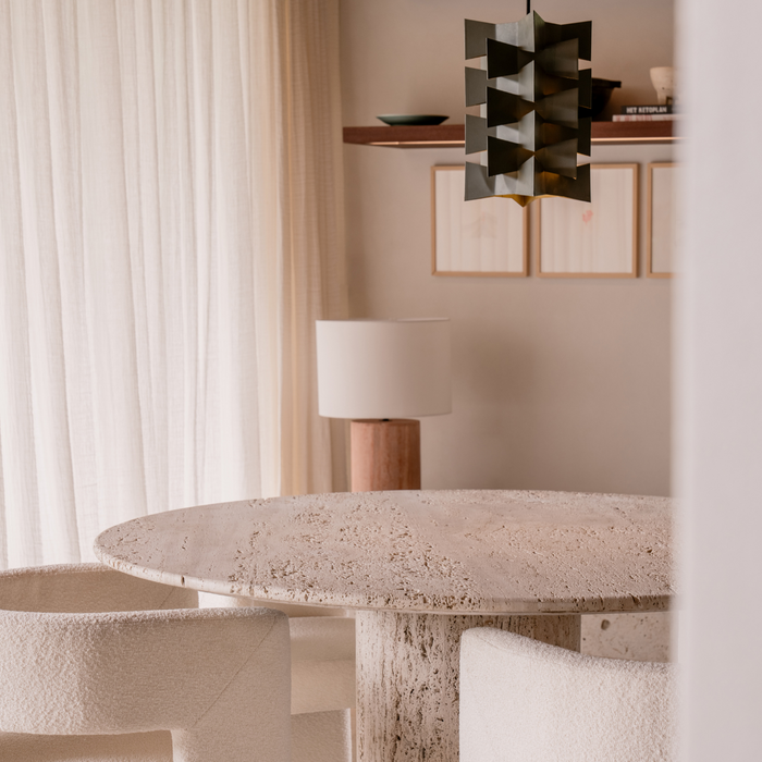 Suchen Sie einen Blickfang für Ihr Esszimmer? Dann ist unser Nana Travertin-Esstisch die perfekte Wahl! Dieser Esstisch hebt sich dank des Materials und der Form von alltäglichen Esstischen ab. Der Tisch ist nämlich aus weißem Travertin gefertigt, was ihm ein einzigartiges Aussehen verleiht. Die runde Form sorgt für einen verspielten Effekt, der Ihr Esszimmer komplett macht.