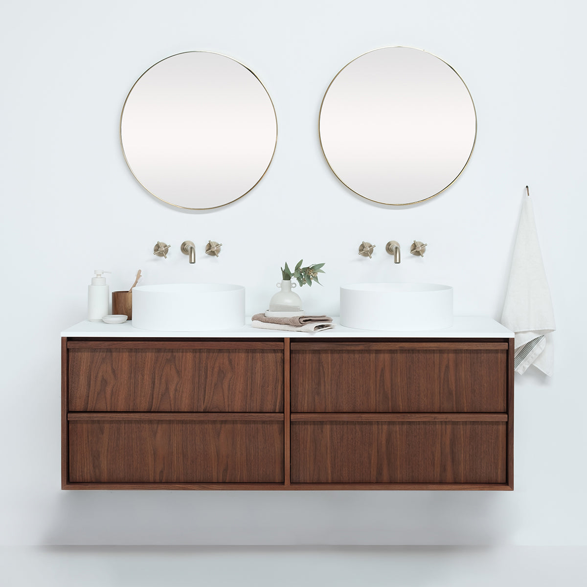 View all dataThis beautiful wooden bathroom cabinet Fien in walnut veneer of 150 cm is a real eye-catcher. Buy this walnut bathroom furniture in combination wit...
