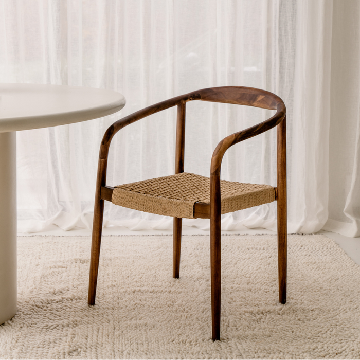 The Burnie dining room chair combines traditional craftsmanship with modern design. With its dark wood walnut frame and hand-woven rope seat, this chair radiates warmth and refinement. Perfect for those looking for a dark wood chair that is both elegant and durable.