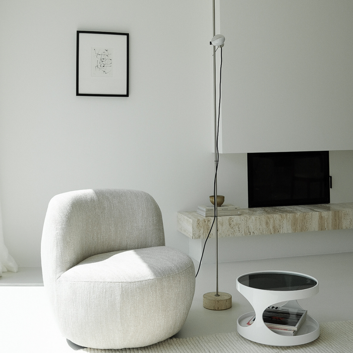 Fabric color in mood image: Sandstone spotted Weave (VDF 116) and fabric color in packshot: Ivory bouclé Weave (VDF117).