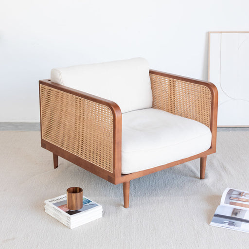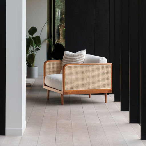 Refinado, contemporáneo y totalmente de moda gracias al asiento de ratán: así es nuestro sillón Flora en roble. ¡Este sillón de mimbre, inspirado e...