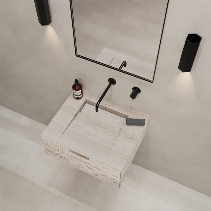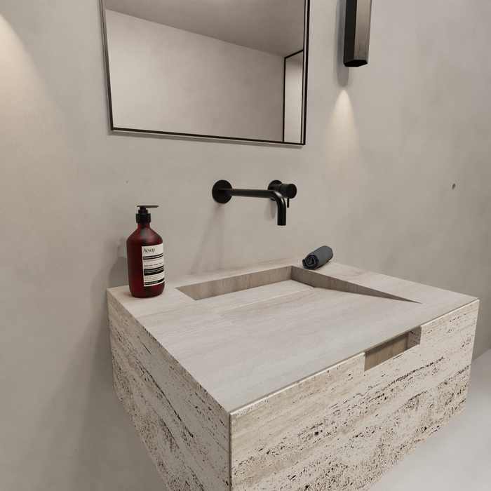 El travertino utilizado en este lavabo es travertino blanco. Es una piedra natural conocida por sus texturas y colores llamativos. ¡Cada lavabo es único, por lo que siempre estarás seguro de tener un artículo moderno y exclusivo! ¿Quieres saber más sobre este material? Lee el en nuestro blog.
