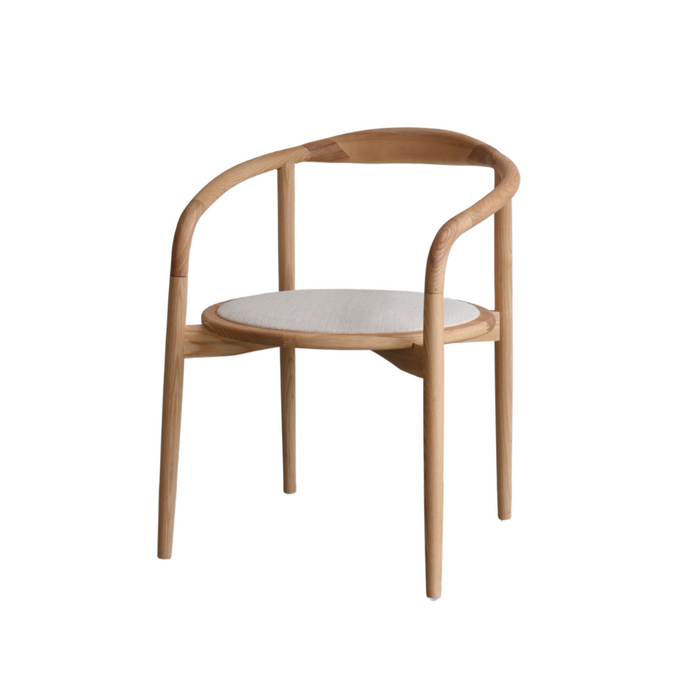 De Eetkamerstoel Ely combineert natuurlijke elegantie met comfort en duurzaamheid. Het lichte essenhouten frame in eikenkleur vormt een perfecte match met de ronde zitting, bekleed met zachte beige-witte stof. Dit tijdloze ontwerp brengt een verfijnde en uitnodigende sfeer naar jouw interieur.