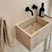 De Handenwasser Chemery is gemaakt uit massief wit travertijn, een natuurlijk kalksteen dat bekendstaat om zijn warme, zachte uitstraling en subtiele structuur. Travertijn is een natuurproduct, waardoor elk stuk uniek is in kleur en tekening.